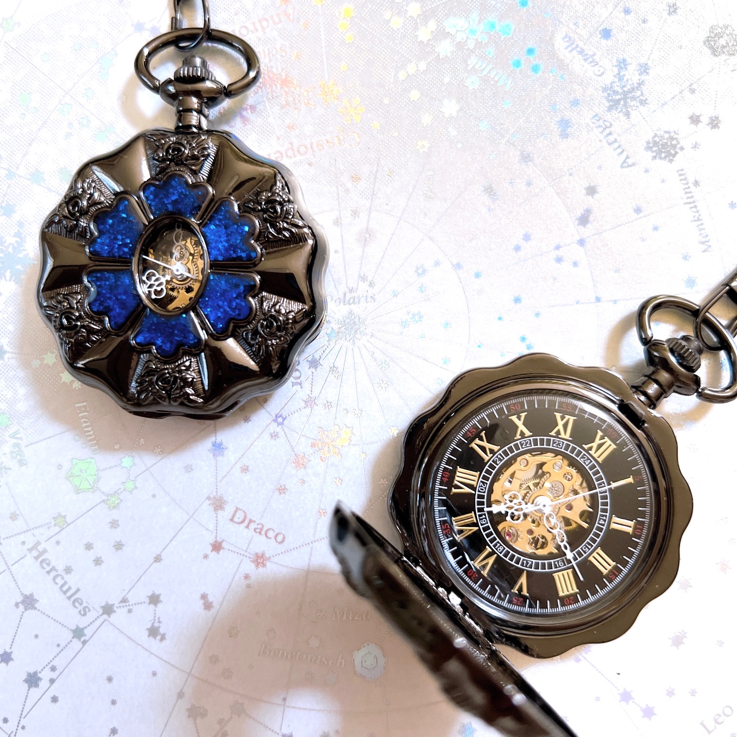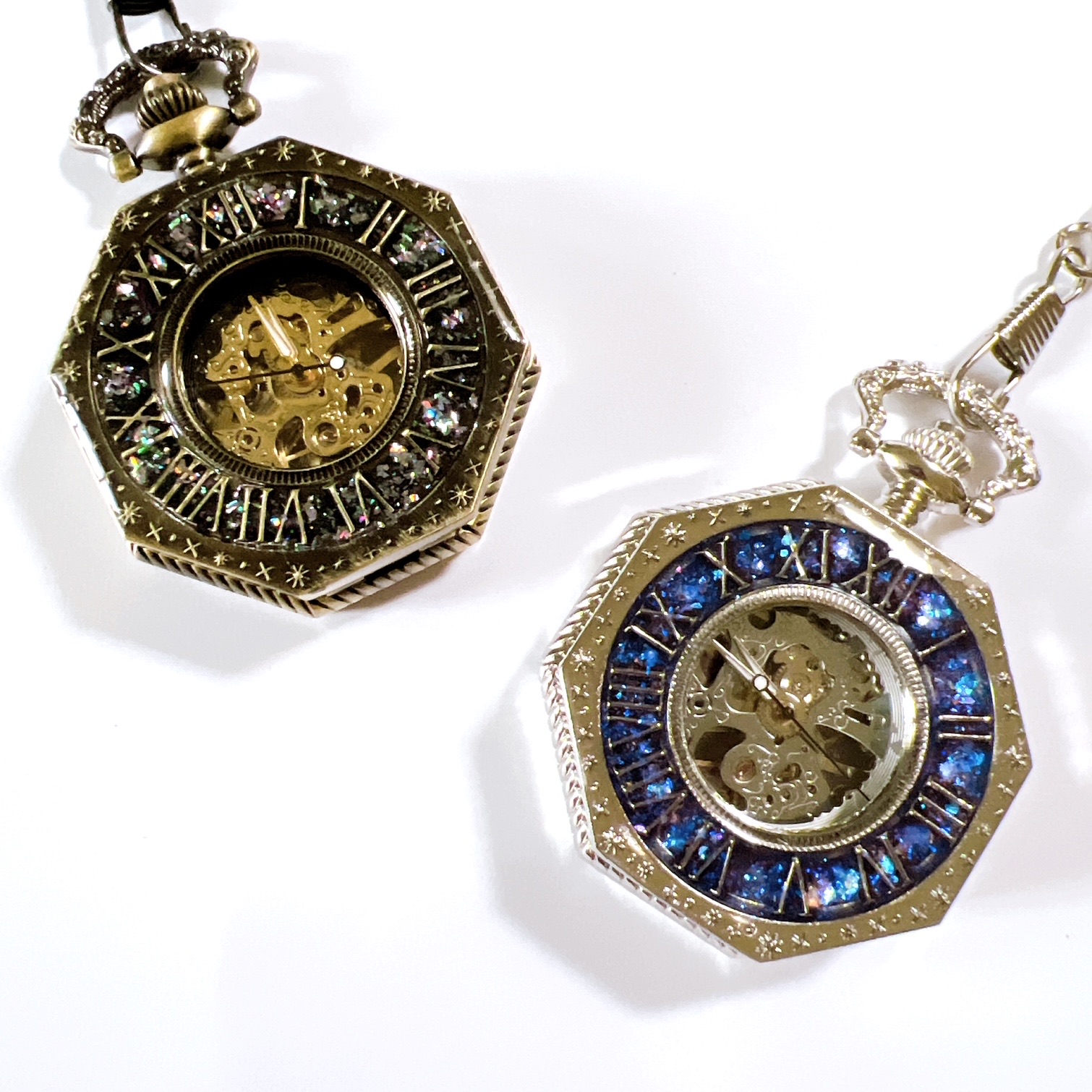 手のひらに収まる魔法の時をテーマに一つずつ装飾している手巻き式の懐中時計です。