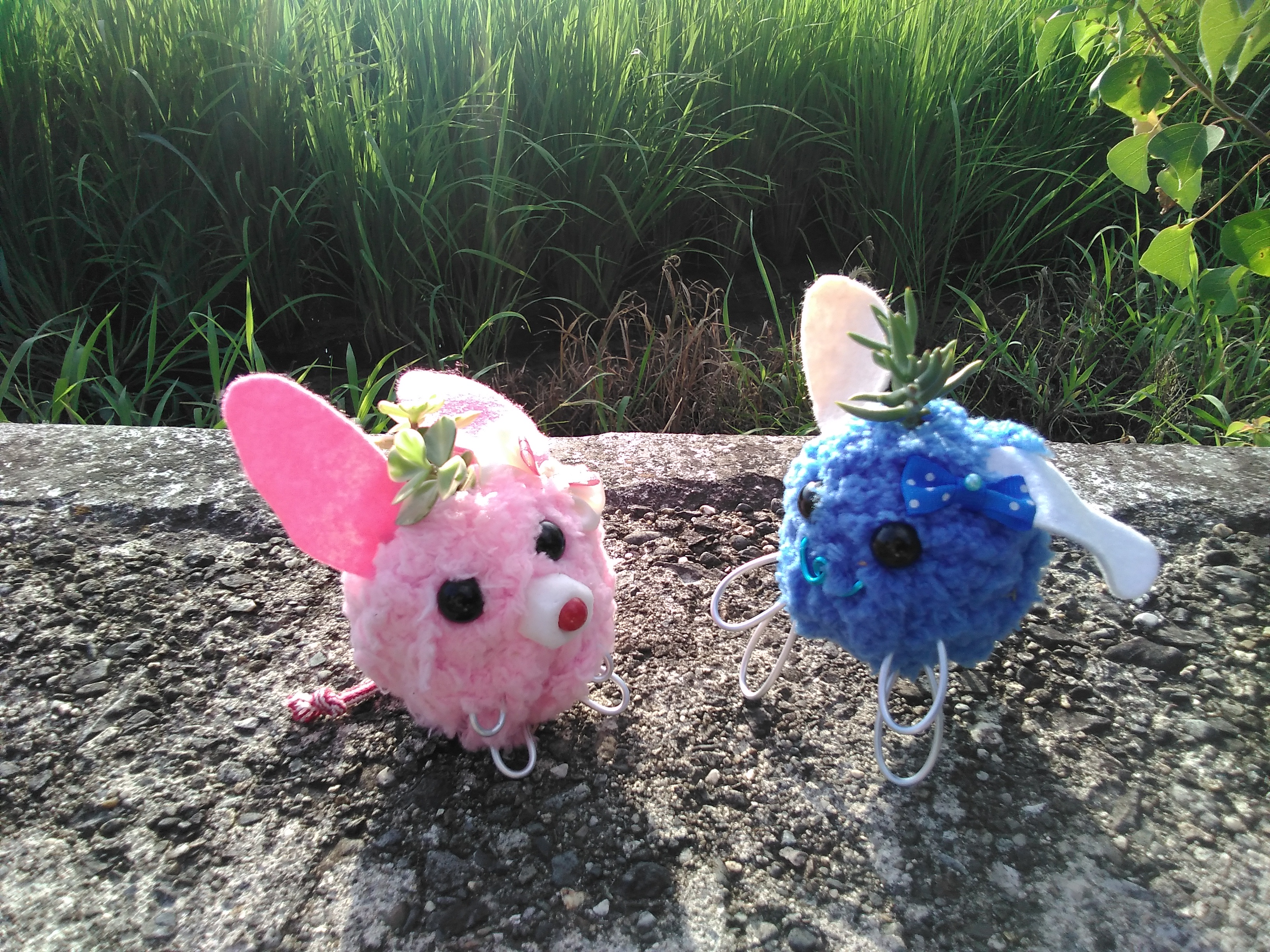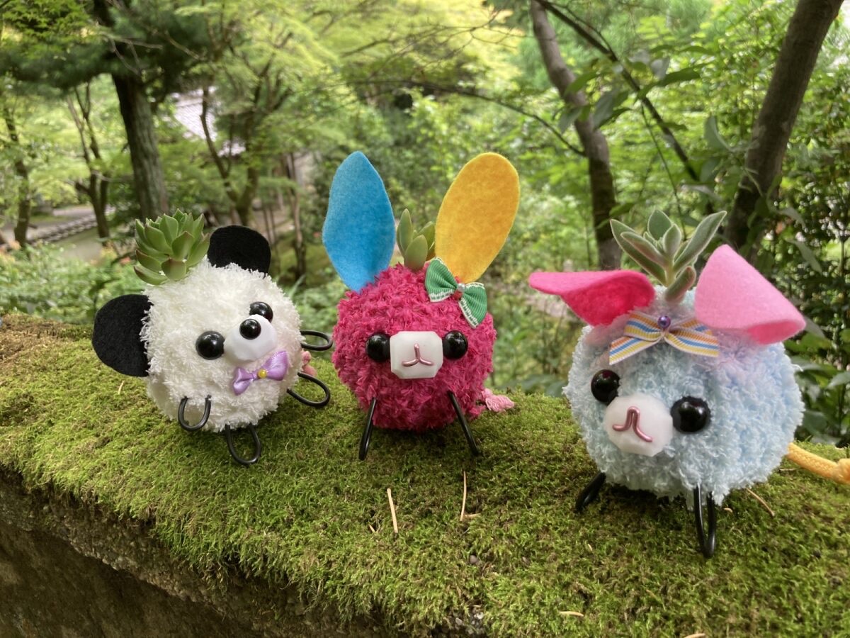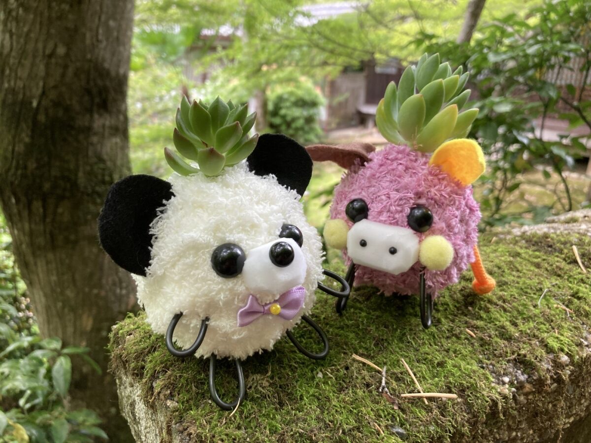 乾燥した苔玉にお好きな色糸を巻き耳と目と鼻を付け頭の上で植物を育てるワークショップです